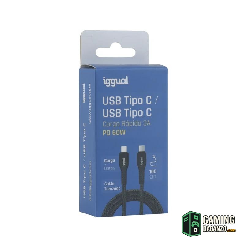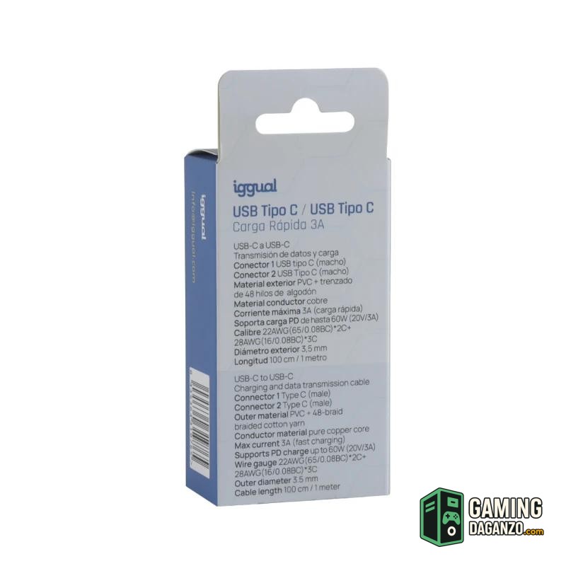 Conecta y carga con total confianza. El cable USB-C a USB-C de iggual combina carga rápida de hasta 3A y soporte PD de 60W con transmisión de datos 2.0. Su trenzado de algodón de 48 hilos y conductor de cobre garantizan resistencia y durabilidad, mientras que su 1 metro de longitud te ofrece comodidad en cualquier uso.