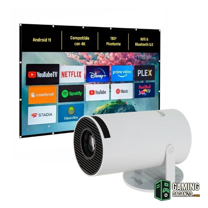 Otras Características | – SO interno: Android 11 – Compatible con: Miracast, AirPlay, AirPin Pro – Mando de control remoto incluido – Formatos soportados: Vídeo: full-format (HEVC/VP9/AVS2/AVC 4K@30fps, MPEG1/MPEG2/AV1 1080p/60fps) Audio: MP3, WMA, ACC Imagen: JPG, BMP, PNG – Tamaño: Proyector: 9 cm diámetro x 16 cm longitud Base: 10 cm diámetro – Peso: 500 g – Color: blanco |