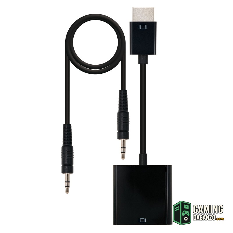 Conversor HDMI a SVGA y audio con conector HDMI macho en un extremo y conector D-sub HDB15 hembra y Jack 3.5 hembra en el otro