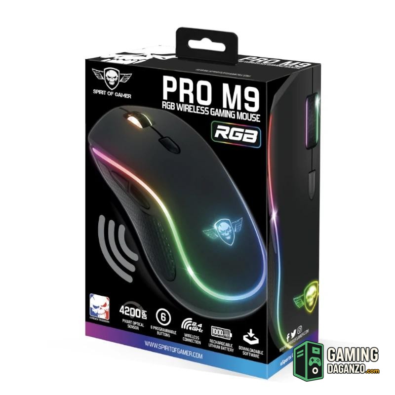 Características | – Resolución: 4200 ppp – Aceleración: 10G – Sensor: PixArt – Óptica – Ratio de transferencia: 1000Hz – Botones: 6 programables – Ergonomía: Simétrico – Software: Disponible para descarga – Distancia de funcionamiento: 10m – Compatibilidad: Windows 7 y posterior – Iluminar desde el fondo: RGB – Velocidad: 30fps – Acceso: Radiofrecuencia de 2,4 GHz inalámbrica Batería – Autonomía: 50 horas con RGB / 130 horas sin RGB – Recargable 900mAh – Tiempo de carga: 2 – 3 horas Dimensiones – 112 x 6,6 x 4,2 cm – 106g Contenido – Guía de configuración rápida – Receptor nano USB – Ratón inalámbrico PRO-M9 RGB |