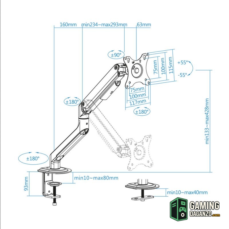 | Características | – Pantallas soportadas: 17" – 32" – Compatible con VESA: 75×75 y 100×100 – Peso máximo soportado de pantalla: 2-9 kg – Brazo regulable con mecanismo asistido por muelles – Ángulo de inclinación: +55°/-55° – Ángulo de giro: +90°/-90° – Ángulo de rotación: +180°/-180° – Altura ajustable hasta 428 mm – Extensión máxima del brazo: 516 mm – Instalación mediante abrazadera o tornillo pasante – Sistema de organización de cables – Compatible con pantallas curvas – Color: Gris/Negro – Peso neto: 2,2 kg. Peso bruto: 2,74 kg – Medidas del embalaje: 435 x 155 x 95 mm Contenido del Paquete – 1 x Soporte – 1 x Kit montaje (incluye herramientas) – 1 x Manual de instalación |